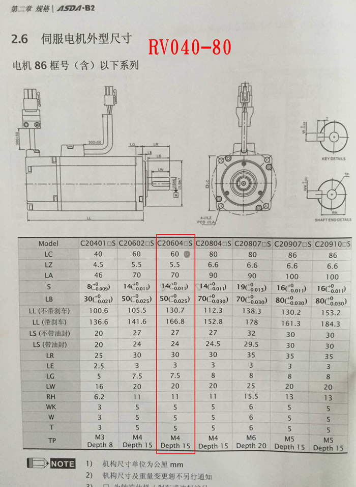 RV040蝸輪減速機配伺服方法蘭實物照片,減速比1:80,並附伺服電機尺寸圖