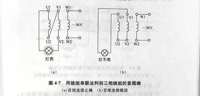 先用萬用表将繞組的6根引線分成3個獨立繞組,然後按圖4-7所示的接法通以低壓交流電(diàn)源(所加電(diàn)壓應使繞組中的電(diàn)流不超過額定值)。如果燈(dēng)泡發亮,則說明串聯的U、V兩相繞組是正向串聯 。即一相繞組的首端接另一相繞組的尾端,如圖4-7(a)所示。如果燈(dēng)泡不亮,則說明是反向串聯,如圖4-7(b)所示。這時,可将一相繞組的首尾端對調再試。判斷出前兩相的首尾端後,将其中一相再與第三相串聯,用同樣方法實驗。最後,可以判斷出三相繞組各自的首尾端。