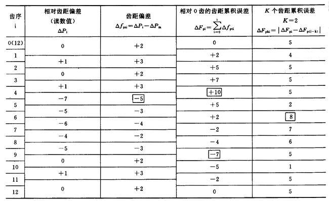 從逐齒測量數據計算fp、Δfpk和Δfpt的方法列於表2,以Z=12、K=2的齒輪爲例。