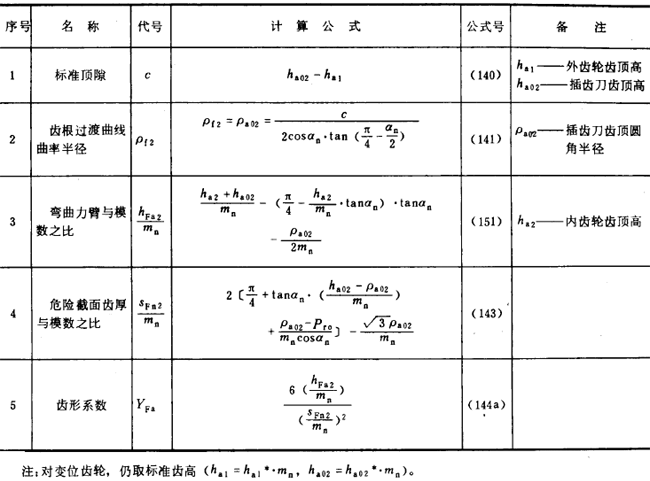 内齒輪的齒形系數YF不僅與齒數和變位系數有關,且與插齒刀的參數有關。爲瞭簡化計算,可近似按替代齒條計算(見圖27)。替代齒條的法向齒廓與基本齒條相假,齒高與内齒輪相同,法向載荷作用角αFen等於αn,並以腳标2表示内齒輪。有關計算公式見表16(适用於Z2>70)。
