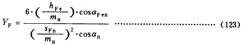 式(123)适用於标準或變位的直齒輪和斜齒輪。對於斜齒輪 ,齒形系數按法截面確定 ,即按當量齒數ZV進行計算。大、小輪的齒形系數應分别確定。ZV應按式(128)計算,或由圖30至圖32查取。