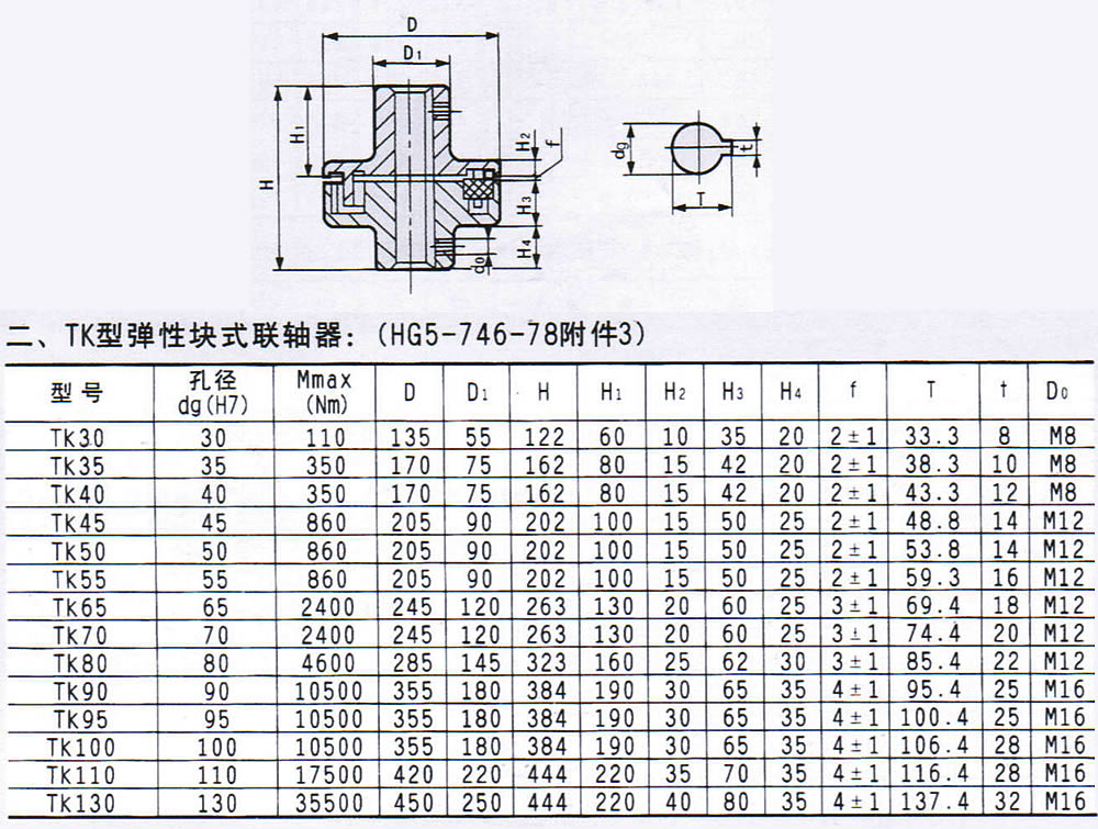 TK型彈性塊式聯軸器有如下型号:TK30,TK35,TK40,TK45,TK50,TK55,TK65,TK70,TK80,TK90,TK95,TK100,TK110,TK130