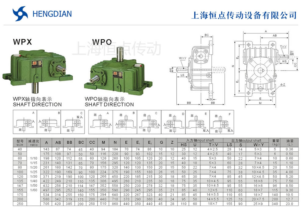 WPO與WPX系列減速機安裝尺寸及外形尺寸,WPO與WPX減速機軸輸入,軸輸出.WPO與WPX系列減速機軸指向表示方法.機座号從40到250,可選速比從10到60.WPO與WPX系列蝸輪蝸杆減速機選型指南