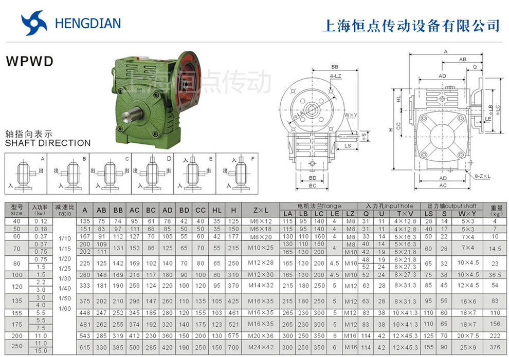 WPWD系列萬能型蝸輪蝸杆減速機選型指南,WPWD減速機軸輸入,軸輸出.WPWD萬能型減速機軸指向表示方法.機座号40到250,速比10到60.WPWD萬能型減速機的外形尺寸及安裝尺寸