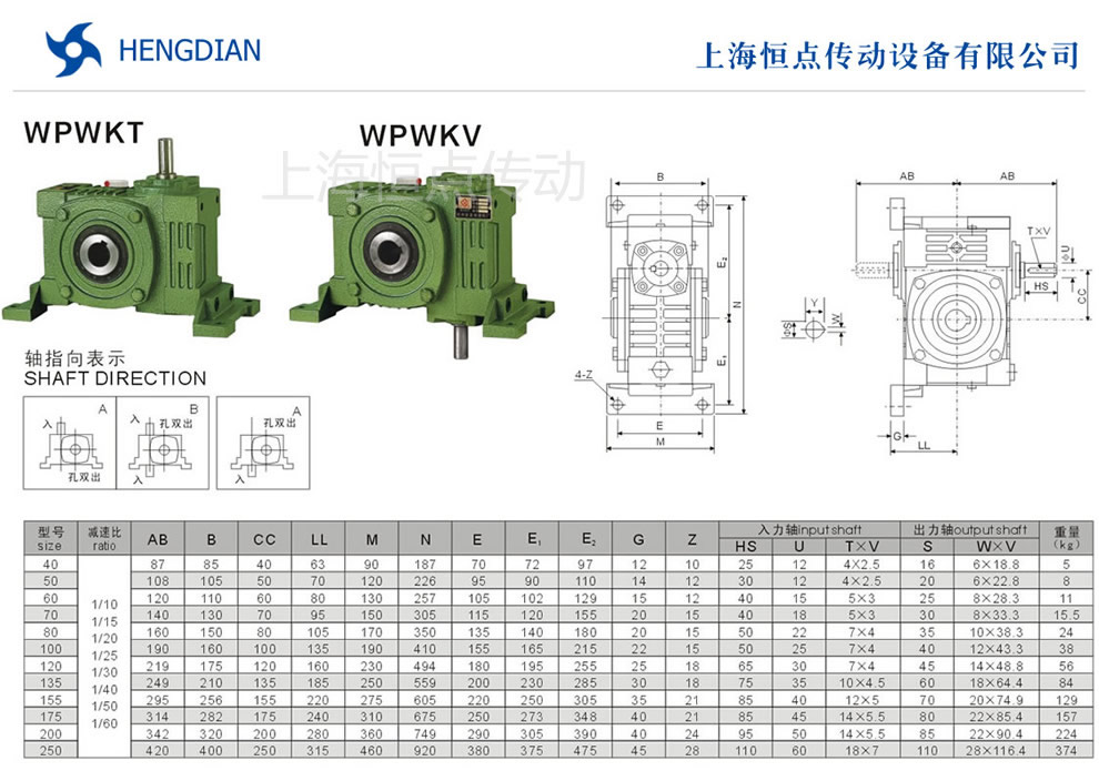 WPWKT與WPWKV萬能型蝸輪蝸杆減速機選型指南,WPWKT與WPWKV萬能型減速機軸輸入,孔輸出.WPWKT與WPWKV減速機的外形安裝尺寸.WPWKT與WPWKV萬能型減速機軸指向表示方法.機座号40到250,速比10到60.