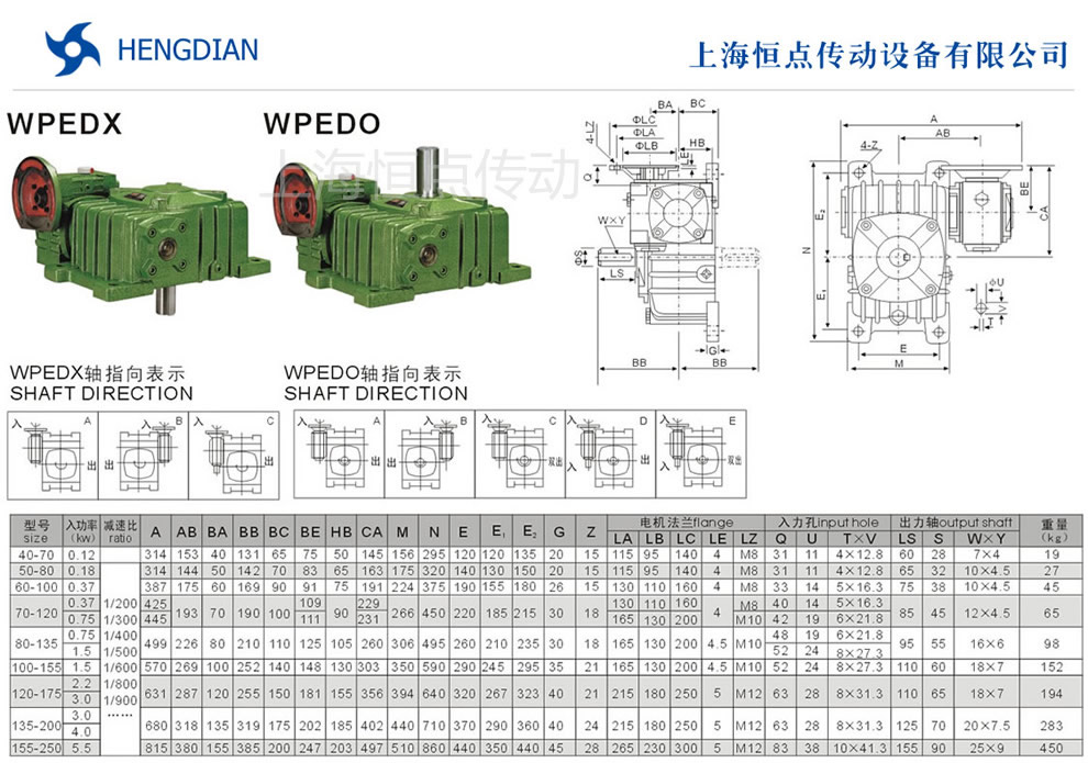 WPEDX與WPEDO雙級減速機的外形安裝尺寸.WPEDX與WPEDO雙級蝸輪蝸杆減速機選型指南,WPEDX與WPEDO雙級減速機法蘭輸入,軸輸出.WPEDX與WPEDO雙級減速機軸指向表示方法.機座号40-70到155-250,速比200到900.
