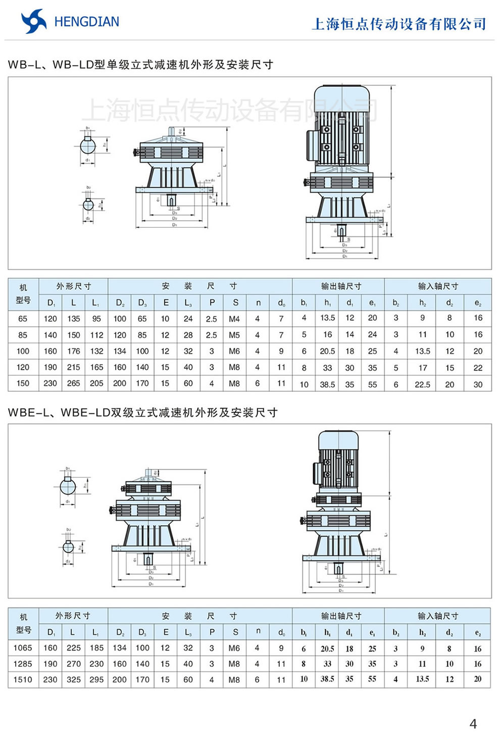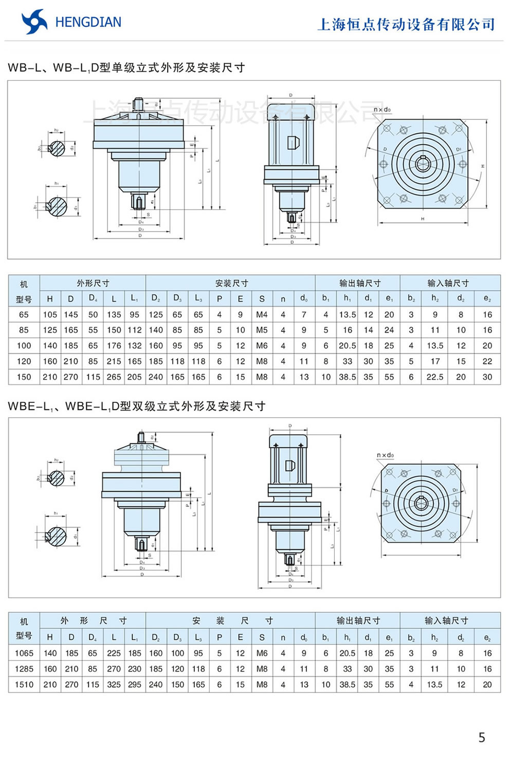 WB-L,WB-LD擺線減速機的單級立式外形及安裝尺寸,WBE-L,WBE-LD雙級立式外形及安裝尺寸,WB微型擺線減速機立式外形安裝尺寸表